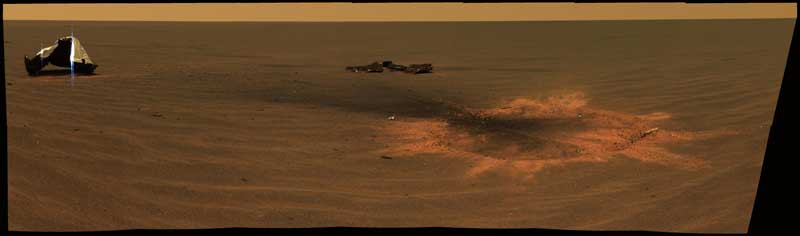 This appears to be a very good addition to the NASA collection of sites that can be used in the classroom. Big Bucks in Online Education Sam Dillon tells of a small school in Colorado that has put nearly everyone in town to work on its online school. Tiny District Finds Bonanza of Pupils and Funds Online is the story of Branson Online, which "has proved to be an attractive alternative for parents who wish to supervise their children's education at home, and for students who hold jobs or are disabled." If you do a Google search for "online charter schools" as I did, you'll end up with over 2,000,000 pages. A similar search for "online school homeschool" produced 404,000 responses. Obviously, using online resources for homeschooling is a booming business. Update Hell Yesterday morning, I'd resolved to get all of the critical updates (eight of them) on my Campaq laptop and the Mac OS X 10.3.8 update on my new Mac Mini before beginning the day's chores at Rose-Hulman. I arrived at work a bit before 7:30 A.M. and finally finished at 8:30! Along the way, my Recent Documents under XP SR2 decided to take 60 seconds to display each time I selected them. Windows also displayed a pop-up from the toolbar advising me that there were critical updates to be installed...while I was installing them! Before the Mac crowd gets too boisterous, the Mac lost its connection to the USB keyboard and mouse (connected via a Dr. Bott Moniswitch), and I had to force a restart after the update. When the machine came up, it had lost my desktop picture preferences, and it required two restarts before the correct setting would hold! I've had a random assortment of glitches with the new machine, including a recurring refusal to shut down, one kernel panic, slow startups, and a few more that I can't remember right now. In defense of the little box, I try to push it like I do my G5 at home. Need a 6461x1905 Desktop Photo? I hate to admit it, but the most popular page on mathdittos2.com is my small collection of Desktop Photos. Educators' News runs a poor third behind the desktops and Fact Controlled Addition & Subtraction. While I'm filling space so the graphics don't fight each other on the page (Yes, I know what <BR "Clear=All"> can do.), let me add that the site currently runs about 75% Windows, 23% Mac, and a smattering of other OS's, including Linux. Getting around to the point, the Astronomy Picture of the Day for Wednesday, Heat Shield Impact Crater on Mars, would blow away even Apple's 30" HD Display! At 6461x1905 it dwarfs the 30" Cinema Display's 2560x1600 recommended resolution. The image shows "the impact site of Opportunity's heat shield" that the Opportunity Rover visited. ![]() Now that's a wide screen! Yeah, I like Dreamweaver.