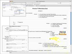 I have a workshop in a week where I'll try it out in the field, but this appears to be a really nice addition to any presenter's (teacher's) bag of tricks. BTW: OmniDazzle appears to be Mac-only. I'd briefly mentioned the Flock web browser in a posting last February. Since that time, I've continued to use Flock to do testing on the web site where I work. I frequently have to have multiple browsers running to log into the site with several different fictitious users. Flock is now at developer release 0.7.6 and seems to be working well. It has a nice blue theme, although the screenshot at right has lots of green in it from the new chameleon theme Moodle introduced with their 1.6 upgrade. From the Flock "tour" page: Welcome to Flock, the safe, spyware free web browser that makes it easier to connect with your friends. With Flock it's a snap to upload, comment, and discover new pics. Read all the news you care about, in one place. Blog freely. Get search results as soon as you start typing in the search box, and much more. I ran across the first online ad I'd seen for the browser this morning while surfing, and that, along with the release of Internet Explorer 7 and FireFox 2, got me thinking about doing a posting again on Flock. It's great that there are so many options in browsers once again for both Macintosh and Windows (and Linux, too, I suppose). I also regularly use Camino, Opera, and Safari, along with occasional use of Mozilla's Sea Monkey. We've pretty well standardized at work on using FireFox. That occasionally gets us into trouble when we forget to check the appearance of a page in Internet Explorer, but we all like FireFox. I've noticed that FireFox 2 is just a tad more sluggish on my Mac than the previous version. Maybe it's just me or our internet connection. Posted again I buried the link to Richard Slettvet's excellent spoof, The No Family Left Behind Amendment, in a long list of links yesterday. It deserves better and should be a MUST READ for all teachers who are wavering on "voting the bums out" next week. Rich teaches special education at Lynndale Elementary in Lynnwood, Washington. Excellent Algebra Tutorial One of the things I'd fought for since the day I started as the User Community Liaison at PRISM was a front page link on our site to similar sites. In some internal political maneuvering recently, I got my wish and immediately posted the page I already had prepared: Other Resource Sites. While there is at least one listing on the page of...well, might as well just say it...a parasite site that slavishly copies everything we do on PRISM, there are many other excellent teaching resources listed. Two of the best I've found are Wisconsin-Online and The Orange Grove. While both require membership to see and use their online teaching resources (not lesson plans, but real, honest to God, teaching resources that can improved classroom instruction), membership in both is currently free with no sign of any coming fees. Wisconsin-Online carries tons of excellent materials, and I highly recommend you visit and try a few of them. While The Orange Grove has very limited K-12 listings (mostly social studies), one math posting stands out as an outstanding resource for middle and high school math teachers. Once you're into the admittedly slow-loading site, click Content, then Browse, and finally K-12 to reach Algebra 1 - Florida Virtual Schools. Thanks for an Excellent Product I really try to downplay the Mac advocacy on this page and site, as I find that people gravitate to the product that best suits their needs when possible. But today, I'm going to add a few comments about what I've been doing this morning. I started out ripping a DVD with Mac the Ripper that I'd used one of those CD/DVD repair kits on. My granddaughter, Katherine, had gotten it out of its container and drug it across the stone kitchen floor! While ripping, I was also upgrading my virus definitions, writing this posting, surfing with multiple browsers. and had my Firewire drive and PowerBook linked to the G5 tower I use at home. In short, I was doing lots of things at once, something that I wouldn't dare try on my PC.