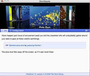 OmniDazzle OmniDazzle by the Omni Group, is a very cool add-on that can add some pizzazz to presentations. It's described as "a set of fun and useful enhancements that help you highlight certain areas of your screen, create visual effects, and track the location of your mouse pointer." I ran across the fairly new (June, 2006) application from a link on MyAppleMenu and a review by Jeff Gamet on the Mac Observer. While Omni's site noted only limited support for my 12" G4 PowerBook, the add-on worked quite well in the "flashlight" and several other modes. The consensus of the folks where I work was that they liked the pixie dust plug-in best. It trails yellow pixie dust from the cursor as you move it around the screen.