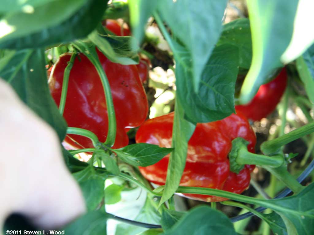 Yesterday, I picked four gorgeous, open pollinated Earliest Red Sweet peppers. ERS is a variety no longer commercially available that I help preserve and distribute through the Seed Savers Exchange. I then picked several dozen open pollinated Moira tomatoes, another variety preserved and distributed via the SSE. While in our large East Garden, I also brought in a couple of watermelons. One was a 32 pound Ali Baba melon, a variety with a pale outer skin and a rich red interior. I wound up my outdoor gardening for the day by picking a couple of gallons of grape tomatoes. Once grape tomato plants start producing, they overwhelm you with small, delicious fruit. I always put our grape tomato plants at the end(s) of our row of caged, main crop tomatoes, to make them accessible to grandchildren.