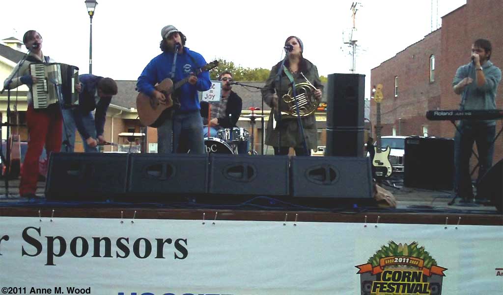 The Yearbook Committee My wife, Annie, and I went into town last night to watch the Yearbook Committee perform at the Sullivan Corn Festival. The Corn Festival is one of those nice, small town events with rides, lots of wonderfully delicious unhealthy food, and free music. The Yearbook Committee describes themselves as "a collective of sorts" with "no lead singer, no sole songwriter: Just a group of musicians with one common goal; to write, record, and perform music." The Yearbook Committee did two great sets in some really chilly weather, ranging from folk music to some hard driving numbers that had the crowd on their feet dancing. As described on their web page, the group plays lots of instruments, including whiffle ball bats and five gallon buckets! And it seems like almost everyone in the group plays at least three instruments!