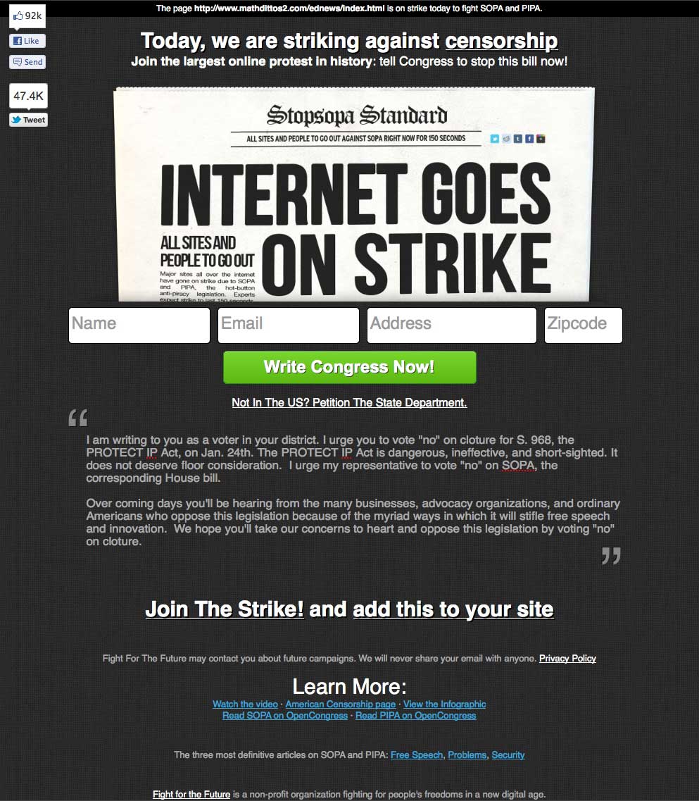 Wikipedia, Others (including Educators' News) Closed Today The English language version of Wikipedia will be blacked out worldwide today in protest "against proposed legislation in the United States – the Stop Online Piracy Act (SOPA) in the U.S. House of Representatives, and the PROTECT IP Act (PIPA) in the U.S. Senate – that, if passed, would seriously damage the free and open Internet, including Wikipedia." A long list of other web sites may also enforce a twelve hour blackout in what is being called the "SOPA Strike." Educators' News, in support of the protest and in opposition to SOPA and PIPA, will be blacked out today from 8 A.M. to 8 P.M. (EST).