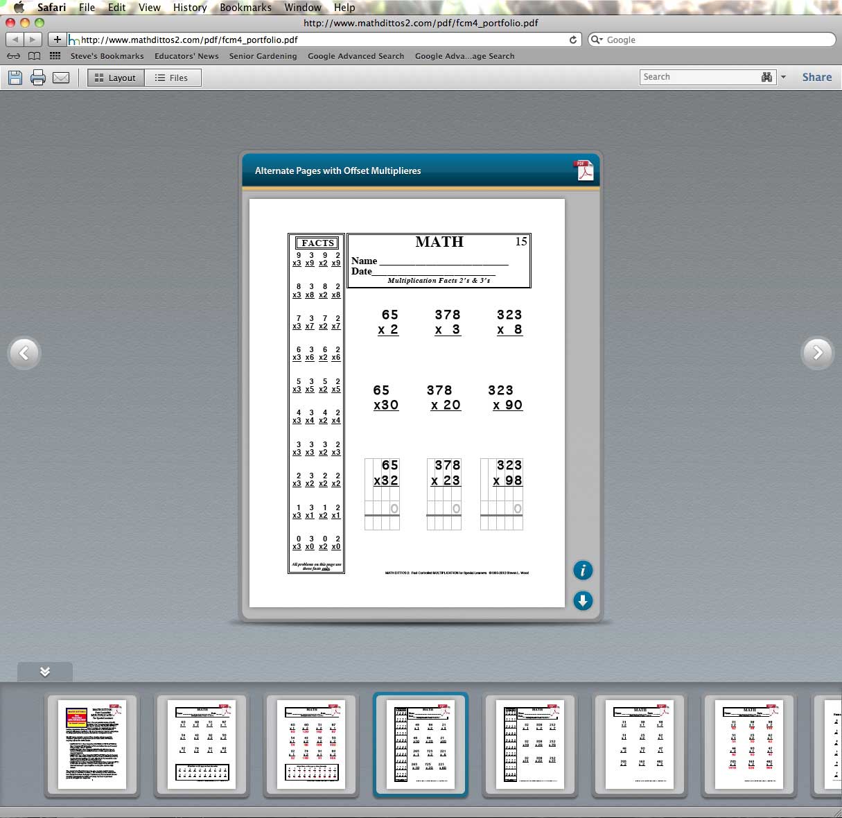 View MATH DITTOS 2: Fact Controlled MULTIPLICATION for Special Learners as an Adobe Portfolio in the Adobe Reader or in your web browser (with appropriate browser plug-in installed). Note that the portfolio file is 3.4 MB in size and may take a few minutes to load, but it's a great way to look around inside the files and see if there's something you can use.