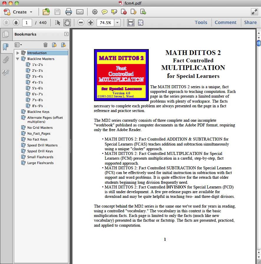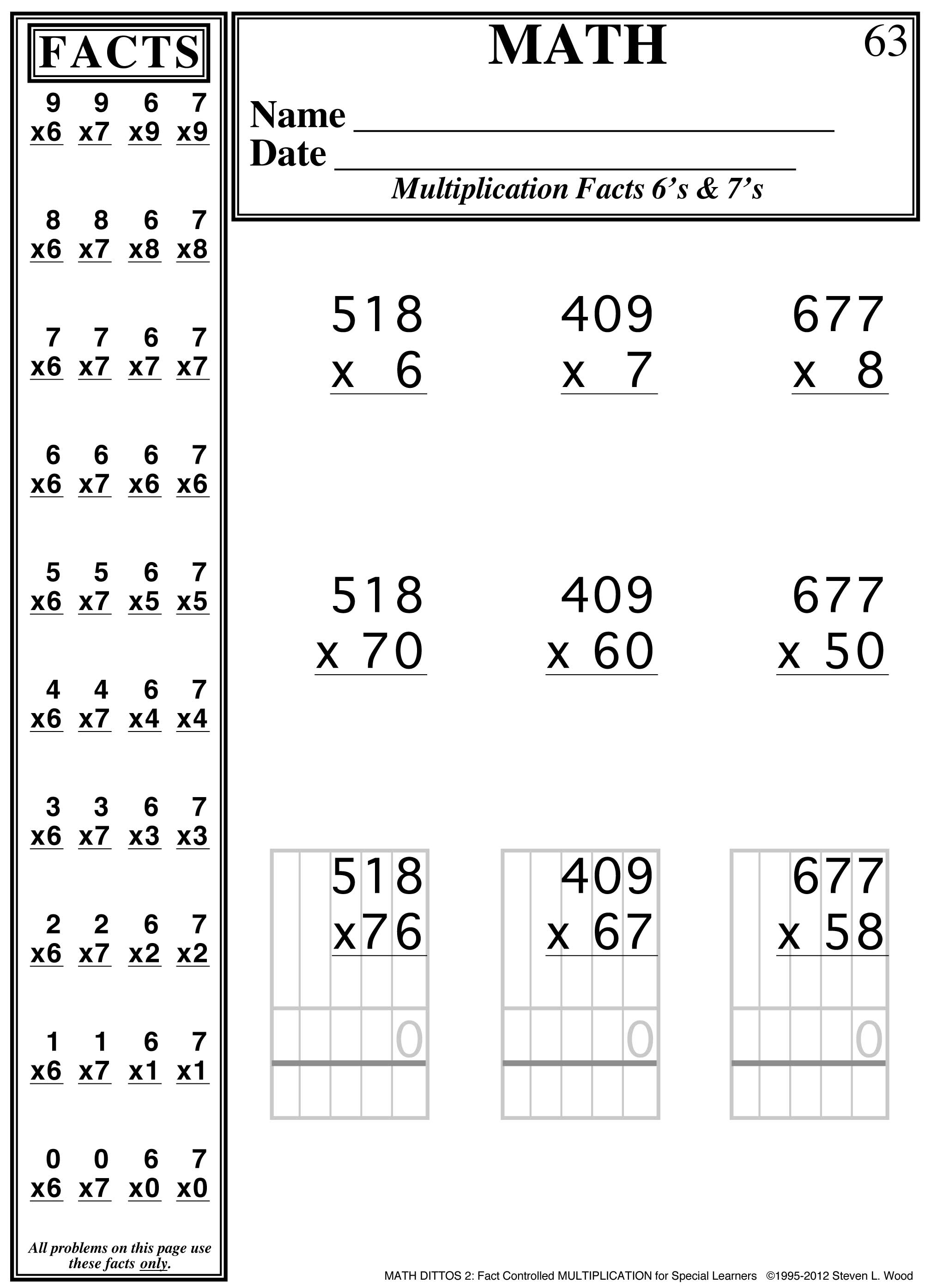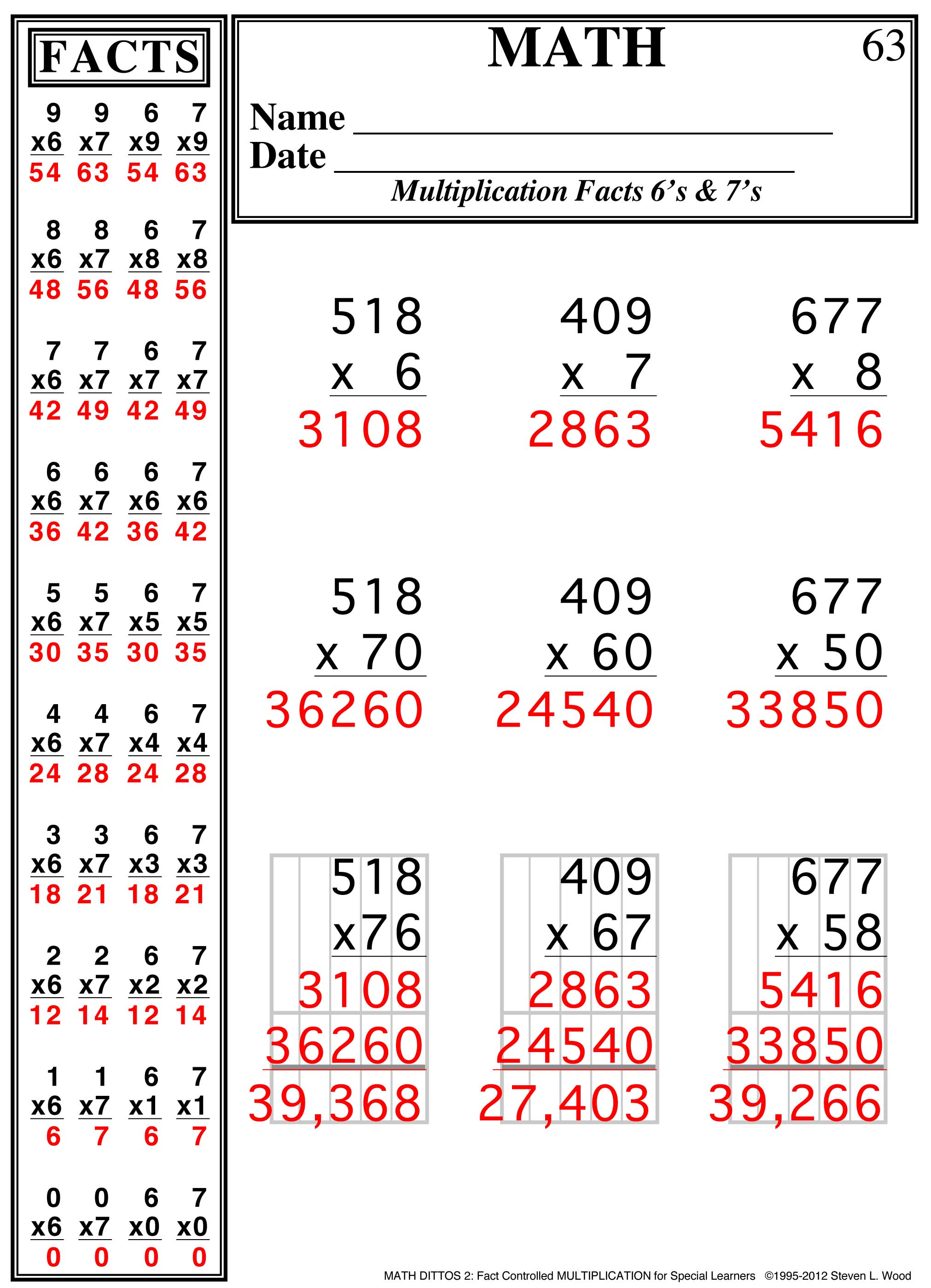 MATH DITTOS 2: Fact Controlled MULTIPLICATION for Special Learners is a unique, freeware tool for teaching multiplication. It is a sequential, ground up, approach to multiplication with fact support, much like a controlled vocabulary in reading. Each page includes fact bars which present only the facts to be used on the page. Both special learners and regular education students benefit from its thorough and systematic approach.